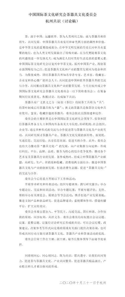 大会上还宣读了《中国国际茶文化研究会茶器具文化委员会杭州共识》,并指出,在条件成熟时,将成立中国茶器具产业联盟,从研发、生产、营销端和收藏、消费端两方面结合,推进中国茶器具文化与产业的创新发展,打造消费生态圈,促进“茶器具文化+”的交流与合作。