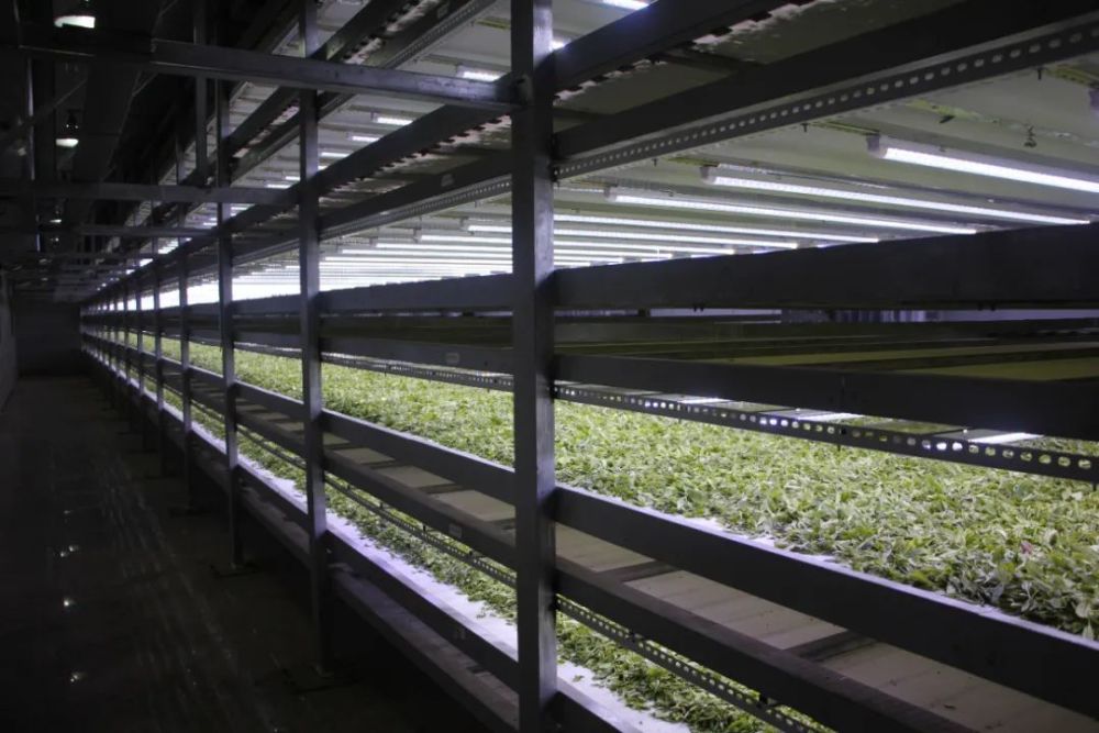 △茶叶加工标准化,图为品品香LED光源萎凋复合式白茶自动化生产线